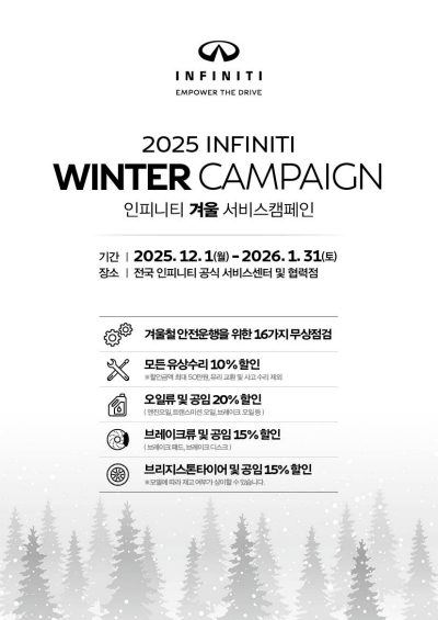 2025년 12월 1일 – KCC모빌리티㈜ (대표이사: 심현보)는 내년 1월 31일까지 인피니티 고객을 대상으로 ‘겨울 서비스 캠페인’을 실시한다.